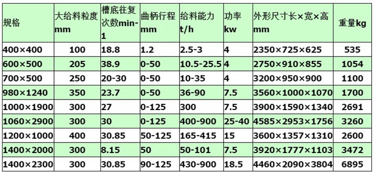 槽式給料機主要由電動機、減速機、聯(lián)軸器、偏心機構、漏板、槽架、滾輪等幾個主要部件組成。其結構的共同點是均裝有可控制料層高度的調節(jié)閘板;在輸料槽下部為一前后移動的給料板。其不同點是給料板角度不一樣,一般為沿卸料方向向下傾斜5o,以及更大的傾角(小于物料的靜堆積角)和角度為零的水平型等。給料板的動作有前后往復移動式,抖動式以及擺動式等,傳動機構均為曲柄回轉式。